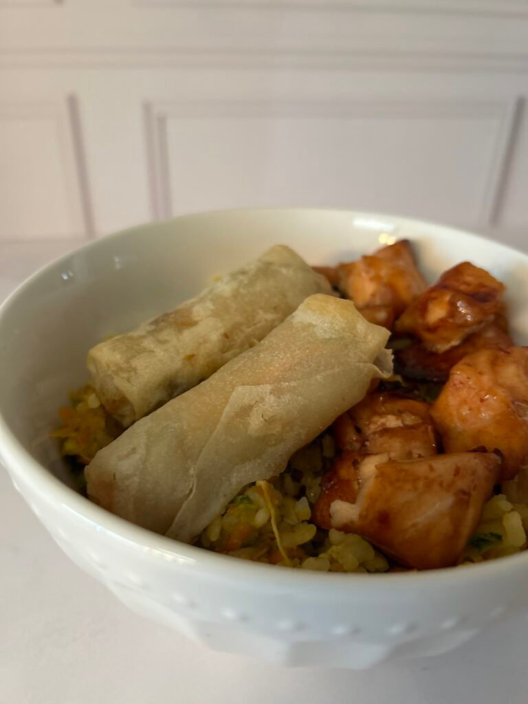 7. Sirve primero el arroz con verduras en cada plato. Coloca encima el salmón horneado y acompaña con rollitos primavera si lo deseas.